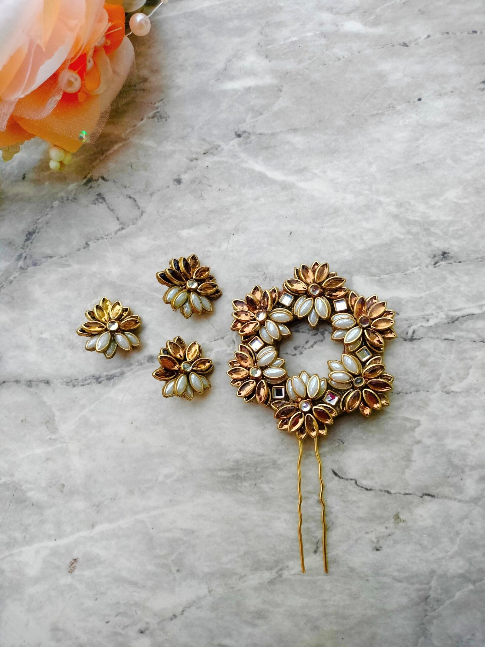 Elevate your traditional look with these exquisite Hair Studs. Inspired by classic Indian heritage, these hair accessories are designed to add a touch of divine elegance to your braids, buns, or half-up hairstyles. Perfect for weddings, festivals, and special occasions.