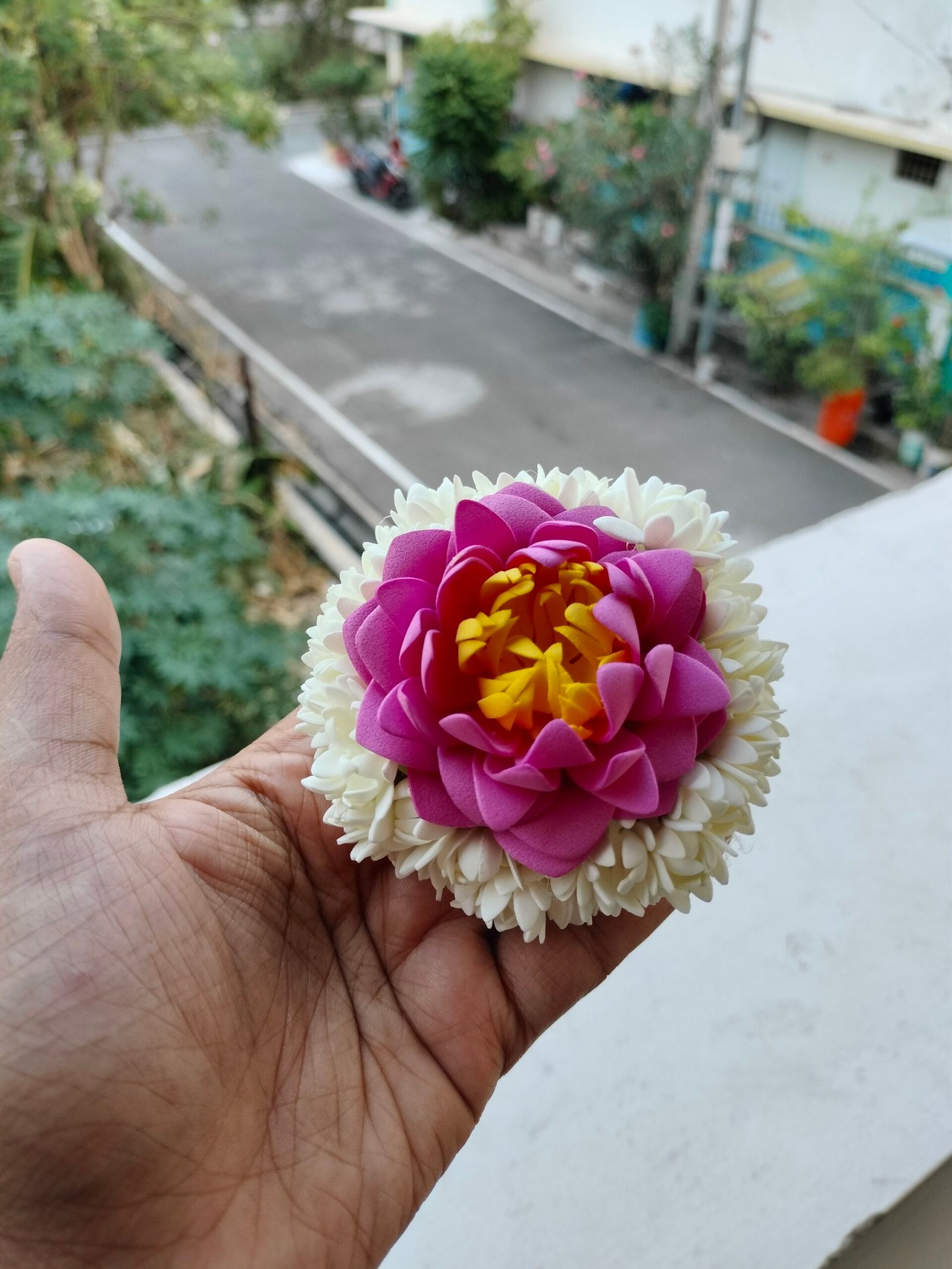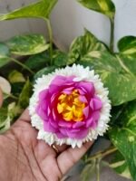 Bring the timeless beauty of fresh blossoms to your hairstyle with our handcrafted Lotus with Mullai Hair Clip. Designed for the modern woman who loves traditional aesthetics, this stunning accessory features a vibrant pink lotus center surrounded by delicate white mullai (jasmine) petals.
